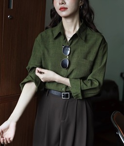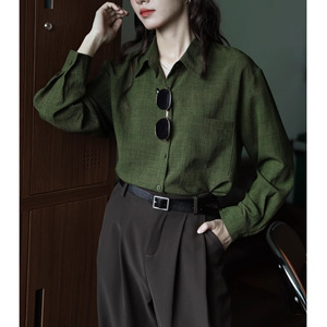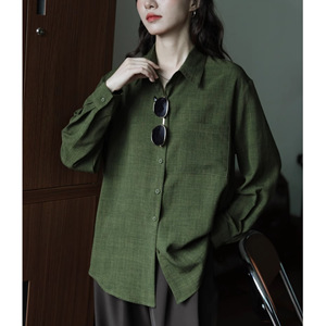 绿色设计感内搭宽松复古港味纯色长袖衬衫女显瘦秋季新款衬衣上衣