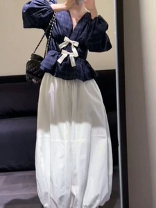早秋新款韩系穿搭蝴蝶结收腰格纹长袖上衣气质高腰花苞半身裙