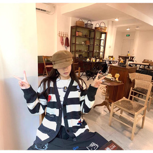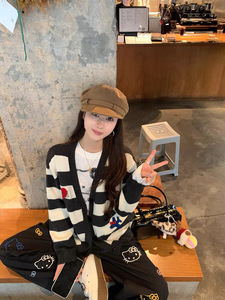 韩国东大门2025秋款新款减龄百搭小众可爱kitty条纹经典毛衣开衫
