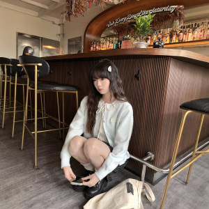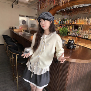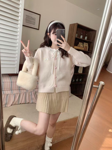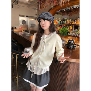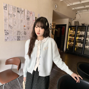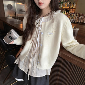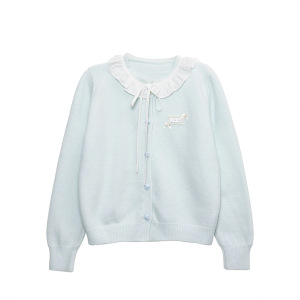 蓝色蝴蝶结系带针织开衫秋季甜美2025减龄小个子新款荷叶上衣外套