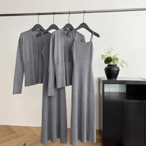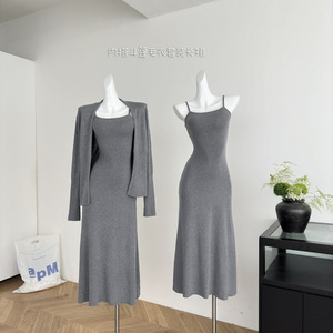 2025实拍秋季新款女式休闲羊毛针织开衫吊带长裙套组