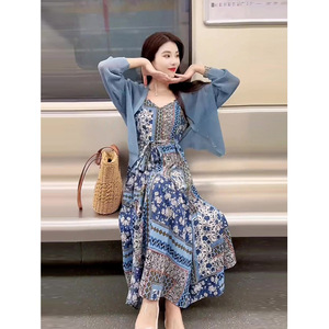 今年流行漂亮套装长裙女小个子时尚蓝色针织衫茶歇法式连衣裙