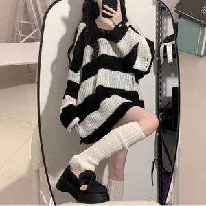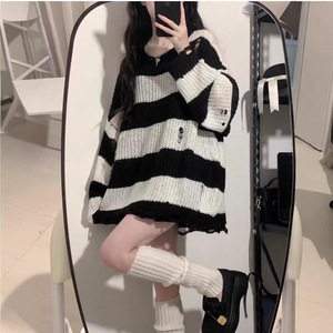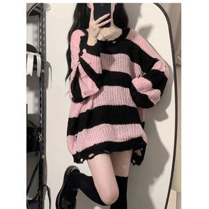 秋季中长款镂空毛衣女宽松慵懒风条纹针织衫2025新款洋气上衣外穿