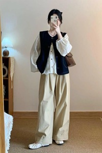 大码胖mm早秋季穿搭一整套女宽松遮肉衬衫马甲阔腿裤减龄三件套装