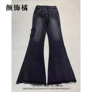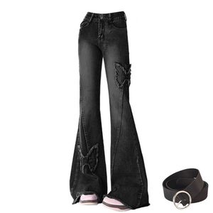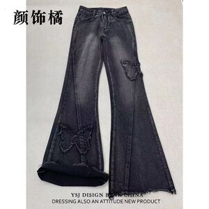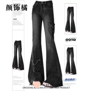 蝴蝶刺绣微喇叭牛仔裤女小个子设计感毛边高腰垂感阔腿百搭马蹄裤