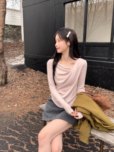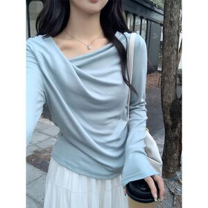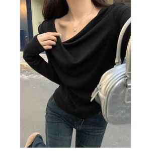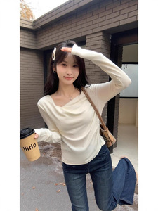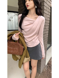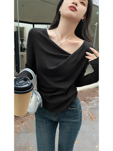 韩系辣妹心机不规则斜肩荡领长袖T恤女2025秋褶皱别致打底衫