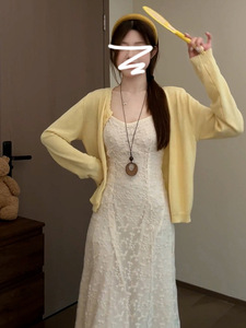黄色开衫+杏色连衣裙【套装】【韩系流行单品穿搭一整套/感超好看漂亮/减龄时尚/今年流行chic小个子