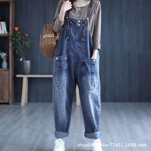胖减龄牛仔背带裤女春秋季新款大码复古宽松哈伦休闲牛仔裤