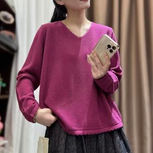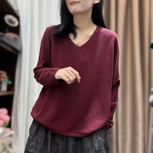 新品宽松大码简约花边V领针织衫时尚毛衣纯色打底衫
