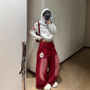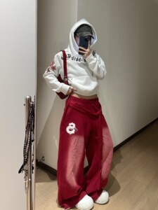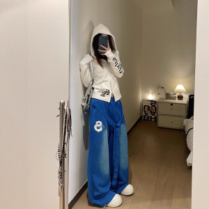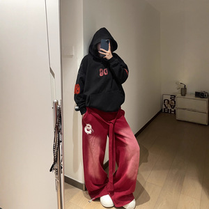 欧美高街渐变泼墨绑带做旧卫裤女宽松慵懒风爵士舞阔腿嘻哈弯刀裤