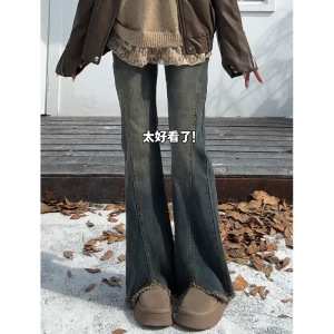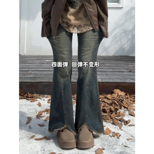 复古蓝毛边微喇牛仔裤女秋季新款大码胖mm高腰显瘦遮胯弹力喇叭裤