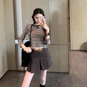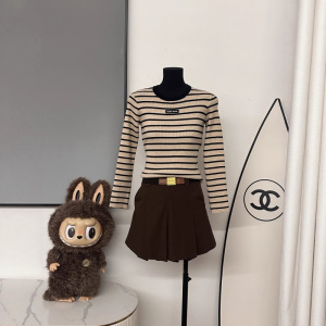 mm 条纹短针织上衣+学院风短裙女29早秋9月新品复古时髦百搭套装