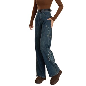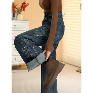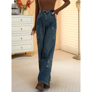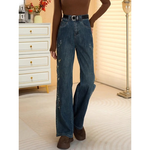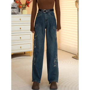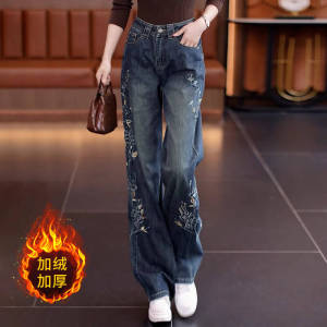 新中式国风刺绣牛仔阔腿裤女2025春秋加绒裤子爆款宽松显瘦直筒裤