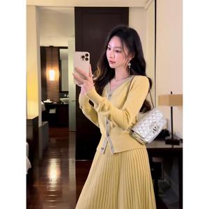 早秋温柔气质穿搭千金洋气减龄小香风气质开衫百褶裙套装网红衣服