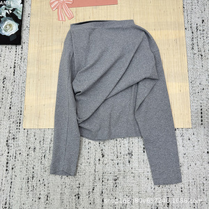 25早秋新款小众潮牌土星刺绣标不规则斜肩长袖针织T恤女露肩上衣