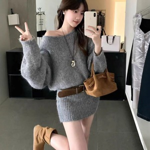 韩系氛围感秋冬穿搭针织衫女斜肩设计感长袖纯欲风气质针织裙子女