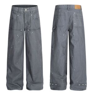 Z037美式复古男女解构型水洗做旧泼墨设计宽松男式宽松直筒工装裤