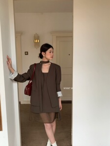 【WOW】韩系氛围感无领西装外套+网纱拼接背心连衣裙套装(配腰带)