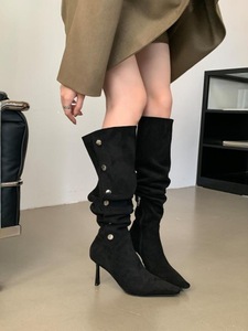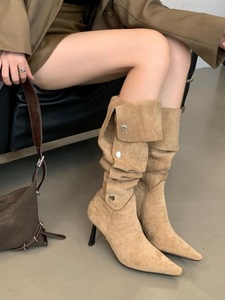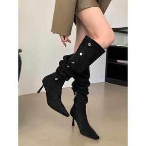 2025西部靴一鞋三穿卡尖头细跟高跟过膝长靴女秋季软皮绒面堆堆靴