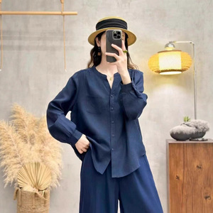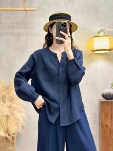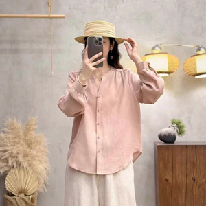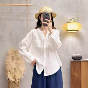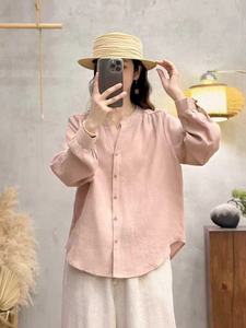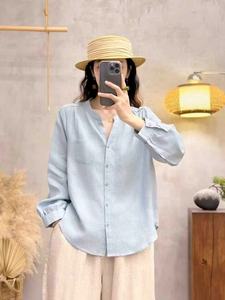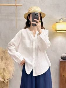 复古文艺纯亚麻V领长袖衬衫2025年秋季新款宽松单口袋简约女上衣