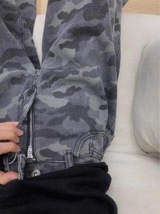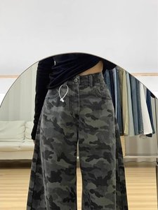 小个子美式迷彩阔腿牛仔裤女春秋新款大码胖mm设计感宽松直筒裤子