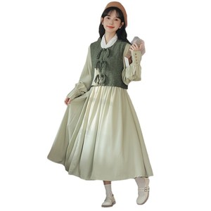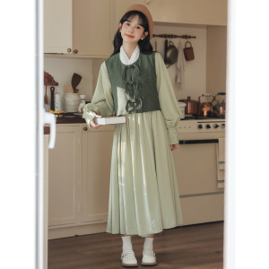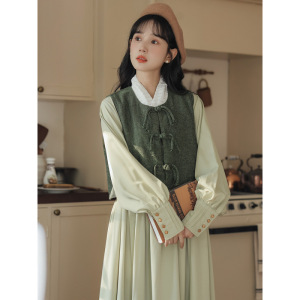 新中式国风马甲连衣裙绿色一整套女日常穿搭收腰百褶长裙两件套