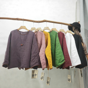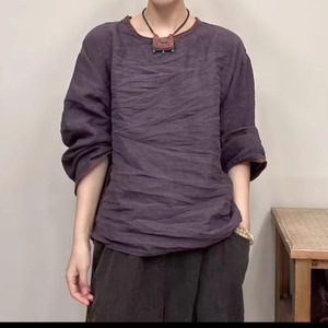 秋季新品2025 拼色圆领亚麻衬衫 净版文艺休闲套头百搭衬衣
