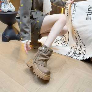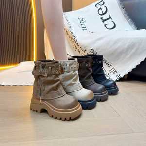 中跟(3-5cm)圆头时装靴PU靴子粗跟橡胶中筒靴冬季