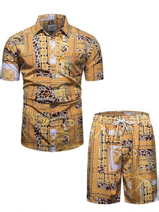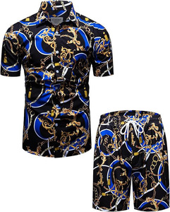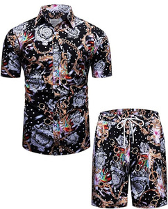 男士豪华服装套装黑金衬衫和短裤 2 件套运动服套装巴洛克纽扣西