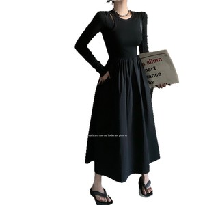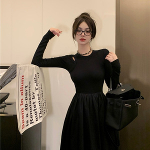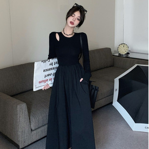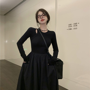长袖镂空针织拼接连衣裙子女2025新款设计感小众收腰气质黑色长裙