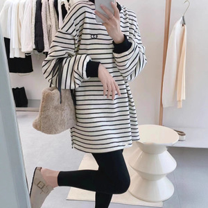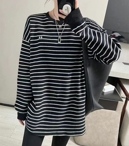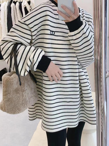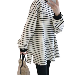 条纹加绒打底衫女秋冬德绒上衣新款宽松中长款卫衣内搭磨毛恤潮