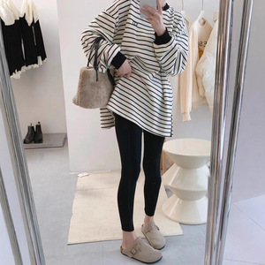 米白条纹【遮屁股 洋气 时尚 大版 搭配鲨鱼裤的上衣】