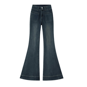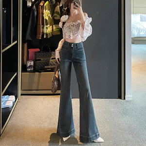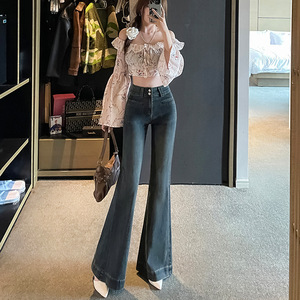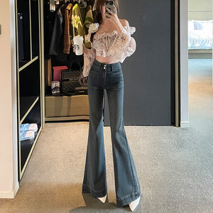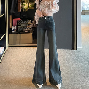 水泥灰喇叭牛仔裤女加绒长裤秋冬季修身弹力显瘦设计感拖地微喇叭