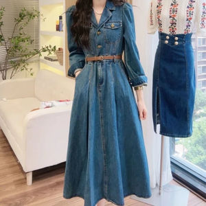早秋2025新款时尚复古洋气西装领单排扣长款过膝长袖牛仔连衣裙