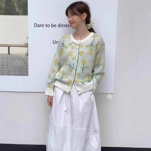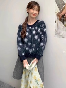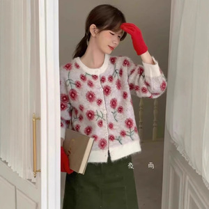 韩版设计感秋冬新款宽松显瘦圆领花朵印花针织开衫女百搭时尚上衣