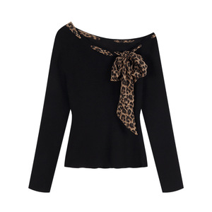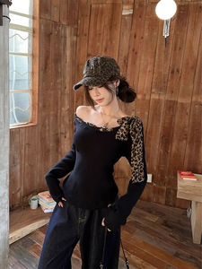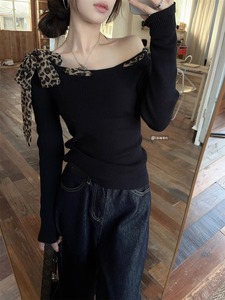 黑色豹纹斜肩针织打底衫女秋季设计感露肩毛衣长袖t恤甜辣妹上衣