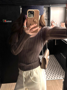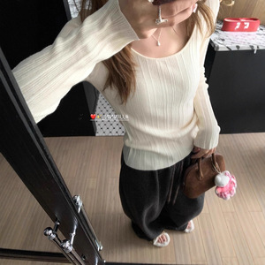 舒适u领长袖打底T恤女春秋季新款韩系气质收腰修身显瘦休闲针织衫