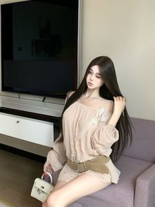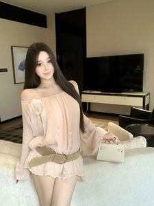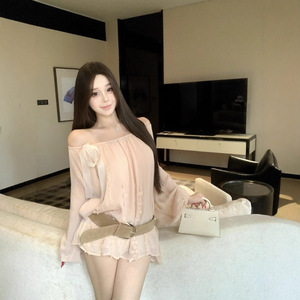 一字肩法式花朵系带长袖衬衫女夏季小众宽松雪纺衬衣纯欲百搭上衣