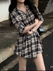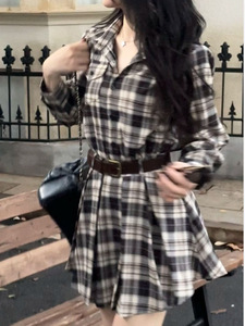 初秋复古收腰格纹长袖衬衫连衣裙