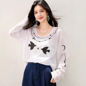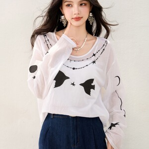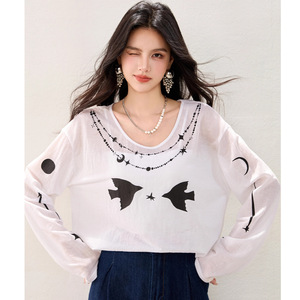 R5567牛津麻轻薄做皱印花微透长袖罩衫上衣宽松卡通图案T恤长袖秋