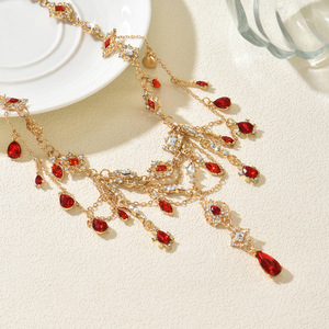 哥特项链批发跨境重工流苏红色宝石吊坠高级复古法式叠戴锁骨链女