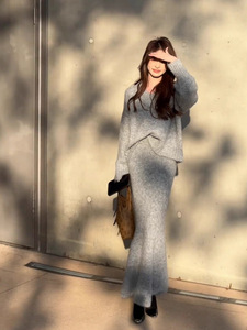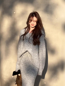 【现货】慵懒风毛衣套装裙女秋冬季V领针织上衣半身裙时尚两件套
