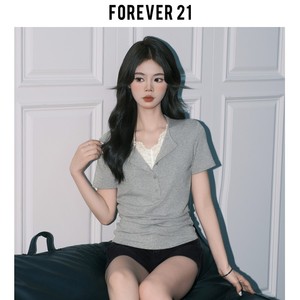 Forever21气质灰色蕾丝假两件V领针织小衫女纯欲修身长袖打底上衣