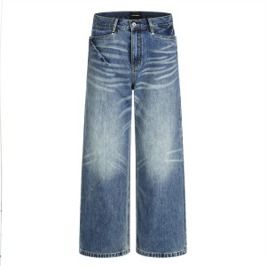 洗水波纹磨白直筒牛仔长裤复古朋克街潮个性口袋宽松阔腿裤子男士
