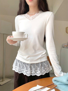 韩系纯欲蕾丝花边德绒打底衫女秋冬季温柔设计感修身内搭长袖上衣