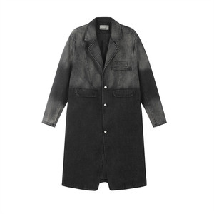 过膝加长款牛仔外套男士秋冬朋克渐变扎染洗水牛仔做旧宽松风衣