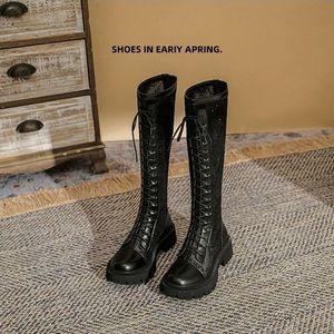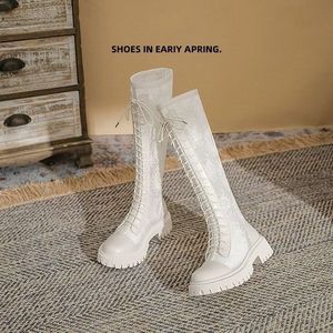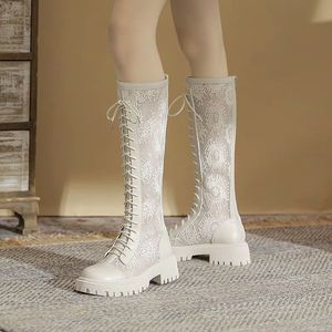 马丁靴女2025夏季新款白色长筒靴网纱透气凉靴厚底百搭绑带高筒靴