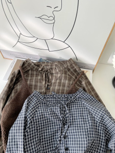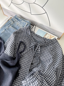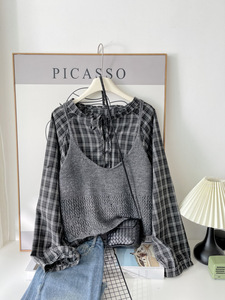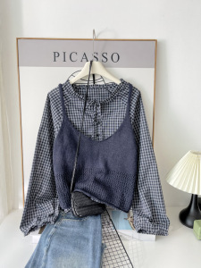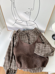 抖音韩版时尚镂空针织吊带背心女木耳边格子长袖衬衫两件套6258