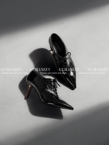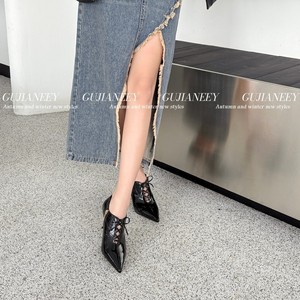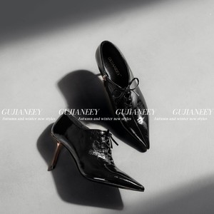 欧洲站女鞋25秋时尚气质款软牛漆皮尖头系带金属细中高跟踝靴单鞋