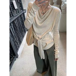 2025秋冬新款韩版韵味法式气质显瘦绑带收腰针织衫长袖T恤上衣女
